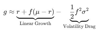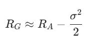 Does this look familiar? This is the exact formula we just derived, but explicitly showing the divergence between the geometric mean and the arithmetic mean. This means that the higher the volatility (sigma), the lower your realized compound return (RG) will be relative to the average daily return.