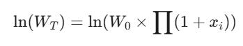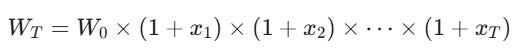 In finance, your wealth at time T (WT) is not the sum of your daily returns; it is the product of your daily growth factors. If xi is your return on day i (e.g., +0.05 or -0.02):