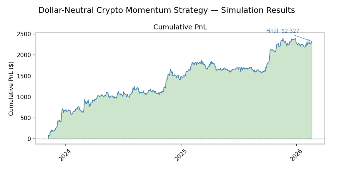 This isn’t just a side effect of Bitcoin’s price movements; a market-neutral approach (buying the top winners and shorting the bottom losers) delivered double the risk-adjusted returns (Sharpe Ratio of 1.98) of a simple Bitcoin buy-and-hold strategy.