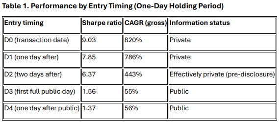 They find that 70–80% of the abnormal return occurs between the transaction and the filing (a window where the information is legally private). Strategies that wait to trade until the public filing date generate negligible alpha, with Sharpe ratios collapsing from over 9.0 to 1.5.